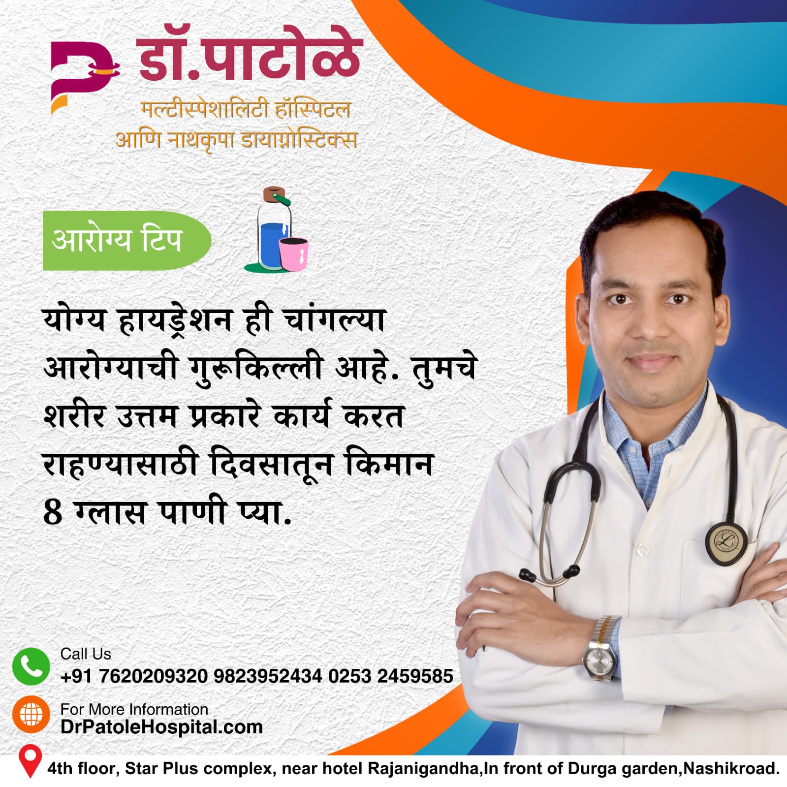 “योग्य हायड्रेशन ही चांगल्या आरोग्याची गुरूकिल्ली आहे. तुमचे शरीर उत्तम प्रकारे कार्य करत राहण्यासाठी दिवसातून किमान 8 ग्लास पाणी प्या.” – डॉ.प्रशांत पाटोळे